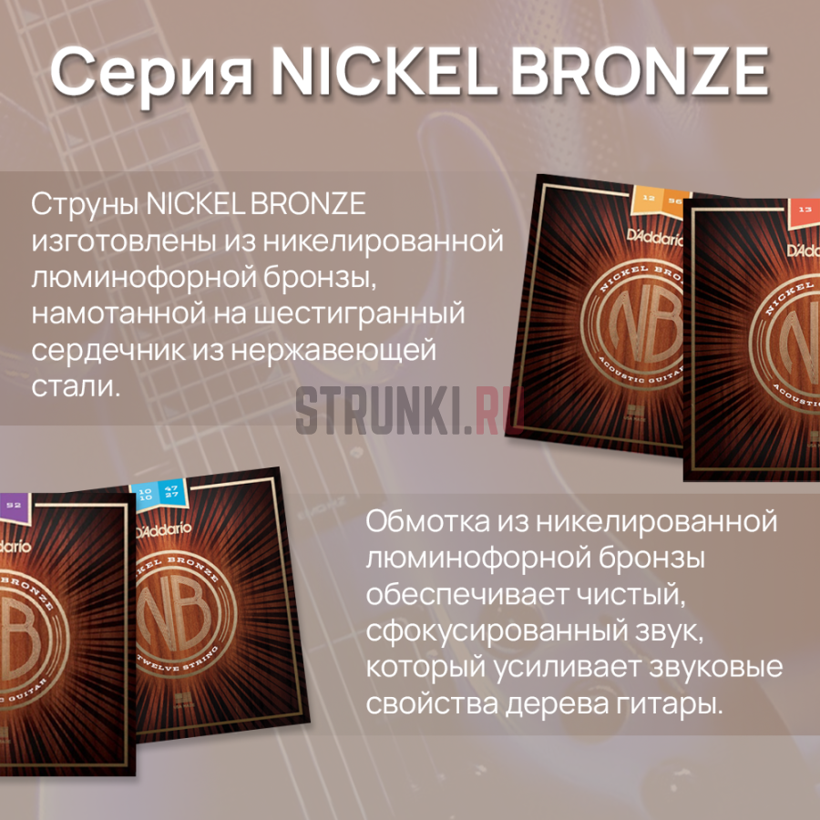 Струны D'Addario линейки Nickel Bronze представляют собой уникальное сочетание сердечника из стали класса NYXL (высокоуглеродистый сплав) и обмотки из никелированной фосфор-бронзы.
