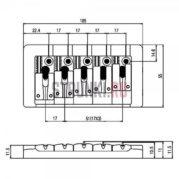 Современный литой бридж. Цвет хром. Возможность крепления струн в 3х позициях - через корпус, за седла и за основание бриджа. Отличное качество.