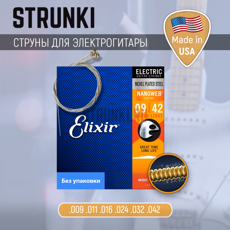Ищешь, где купить Струны для электрогитары Elixir 12005 Nanoweb Super Light 9-42, без упаковки? Заказывай на Струнки.ру!