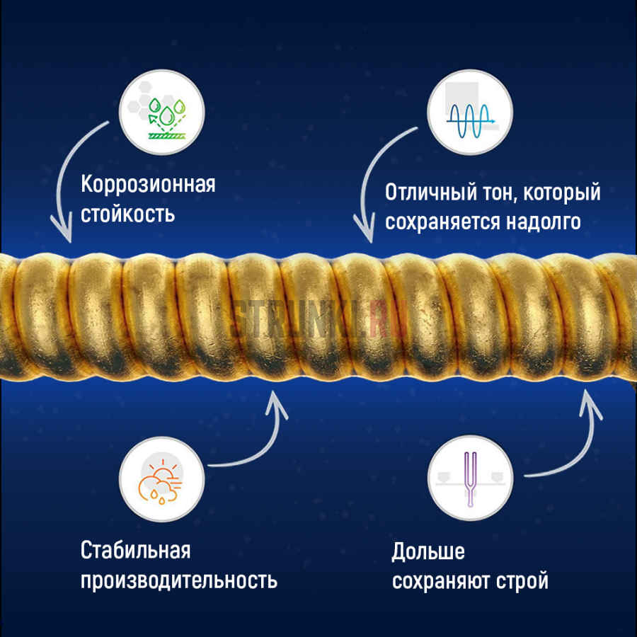 - Защитное покрытие не только на самой струне, но и между витками оплётки
