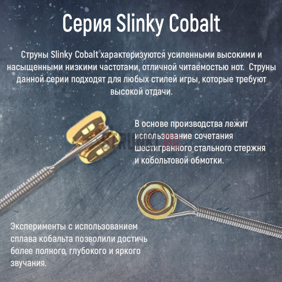 Комплект струн представляет собой стальную сердцевину с обмоткой из сплава Cobalt, который отличается усиленным магнитным взаимодействием между звукоснимателями и струнами, по сравнению с любым другим ранее доступным сплавом.