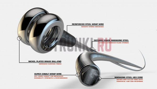 Основная фишка серии M-steel - это сердечник из мартенситной стали: настоящего супер-сплава, который используется преимущественно в военной и авиационной промышленности. Оплетка от серии Cobalt, выполненная из сплава железа и кобальта дополняет сердечник и позволяет добиться яркого, насыщенного звучания и великолепных глубоких низов. Запатентованная стальная оплетка на конце каждой струны позволяет избежать скольжения струны и снизить до минимума риск повреждения - именно так сохраняется идеальный строй в течение долго времени. M-Steel Super Slinky – одни из самых мощных струн, созданных мастерами из Ernie Ball.