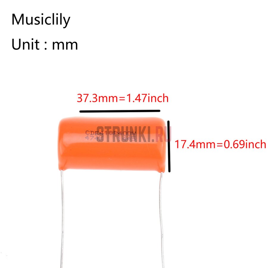 Емкость - 0.47 мкФ (±10%). Обычно устанавливается на потенциометры тона сингловых звукоснимателях. Для бас-гитары и электрогитары.