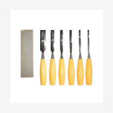 Набор стамесок в пластиковом чемодане состоит из стамесок - 6, 8, 10, 12, 16, 24 мм и двухслойного абразивного заточного бруска размерами 30х50х200 мм.