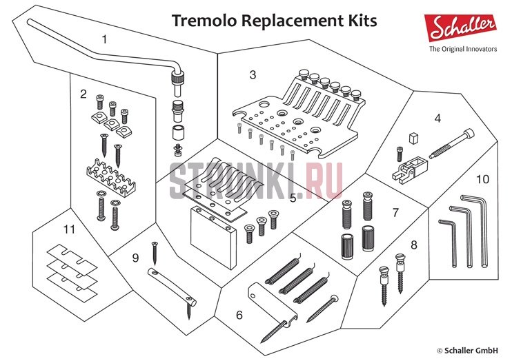 - 1 x Кронштейн-держатель тремоло в комплекте с крепежными винтами 4,2 x 45 мм и 3 пружинами тремоло.