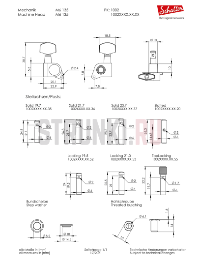 10020571.01.36 Колок одиночный SCHALLER M6 135, реверсный, золото