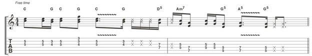 Сыграйте это два раза подряд, но на второй раз после двух приглушенных ударов добавьте подтяжки (или бэнды). Вы должны дотянуть вторую струну до той же ноты, что звучит и на 1-й струне – ноты Е.