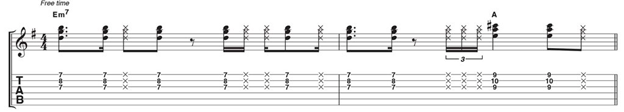 Этот рифф — первый из нескольких в тональности E. Играйте на четырех верхних струнах аккорда E9. Если хотите звучать более профессионально, то скользите вверх от полутона ниже. Затем возьмите мизинец и зажмите ноту на 9-м ладу первой струны — это ненадолго превращает аккорд Е9 в аккорд E13. Держите струны приглушенными там, где вы видите X в табулатуре, затем зажмите аккорд, когда захотите, чтобы он «звучал».