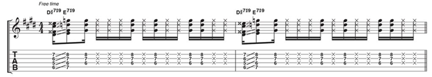 Возьмите аккорд E7#9 — для тех, кто не знаком с джазом, он более известен как «Hendrix chord». Подобно первому риффу, мы скользим вверх на полутон, чтобы создать расслабленное ощущение. Очень редко на фанк-гитаре играют все шесть струн, и этот рифф не исключение.